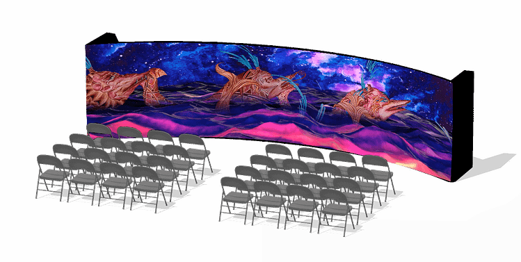 Un affichage vidéo original sur une surface de 14 m² composée de 7 écrans LED verticaux disposés accolés et de manière incurvé. Dans un environnement intimiste, muni d’un système de spatialisation audio 3D, l’ensemble du dispositif permet aux spectateurs de vivre une expérience immersive.